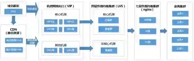 分别经过四层负载均衡和七层负载均衡集群后,流量被分发到业务集群。业务集群之间也会存在互相调用的情况。