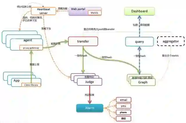 监控系统的底层模块基于 Open-Falcon,上层做了很多深度的二次开发,整体系统架构图如下: