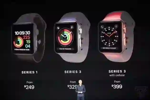 在发布会上,首先亮相的第一款产品就是Apple Watch第三代,尽管外观和前两代产品几乎没有变化(第三代加装了红色的表冠),但在配置方面进行了的全面提升。