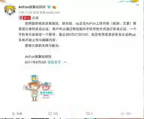 【TechWeb报道】昨日晚间消息,AcFun弹幕视频网今日在官方微博上发布声明称,按照国家相关政策规定,即日起,up主在AcFun上传内容(视频、文章)需要进行身份实名认证。截止到9月27日0:00,如没有完成身份实名认证的up主将不能上传与编辑内容。