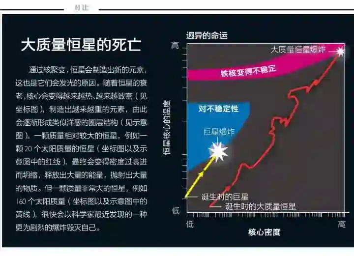 恒星发光是因为它们的核心极为致密,温度极高,能使得氢原子聚变成氦以及更重的元素,释放出能量。密度和温度这两个参数,大体上控制着一颗大质量恒星核心的物理状况及其演化。通常,随着时间流逝,恒星的核心会变得越来越致密,温度越来越高,反应条件会越过一个又一个阈值,使核心里的物质聚变成越来越重的元素——首先是从氦到碳,然后是从碳到氧……每个反应阶段可能会持续数千到数十亿年,具体时间则取决于恒星核心的燃烧对温度和压强的影响有多大。