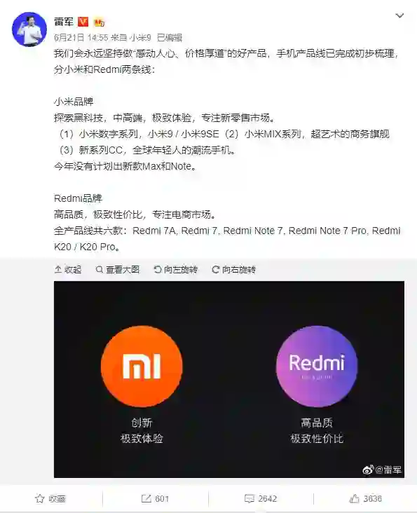 令人遗憾的是,雷军在微博中也说到,小米今年将不会出新款 Max 和 Note 系列新机,目前小米品牌将以小米数字系列、小米 MIX 系列和小米 CC 系列三个系列为主。