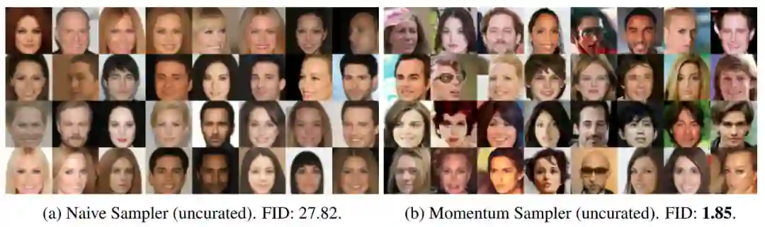 图左使用 Naive Sampler 采样的图像似乎有重复且缺少细节,而图右 Momentum Sampler 显著提升了采样质量和 FID 分数。