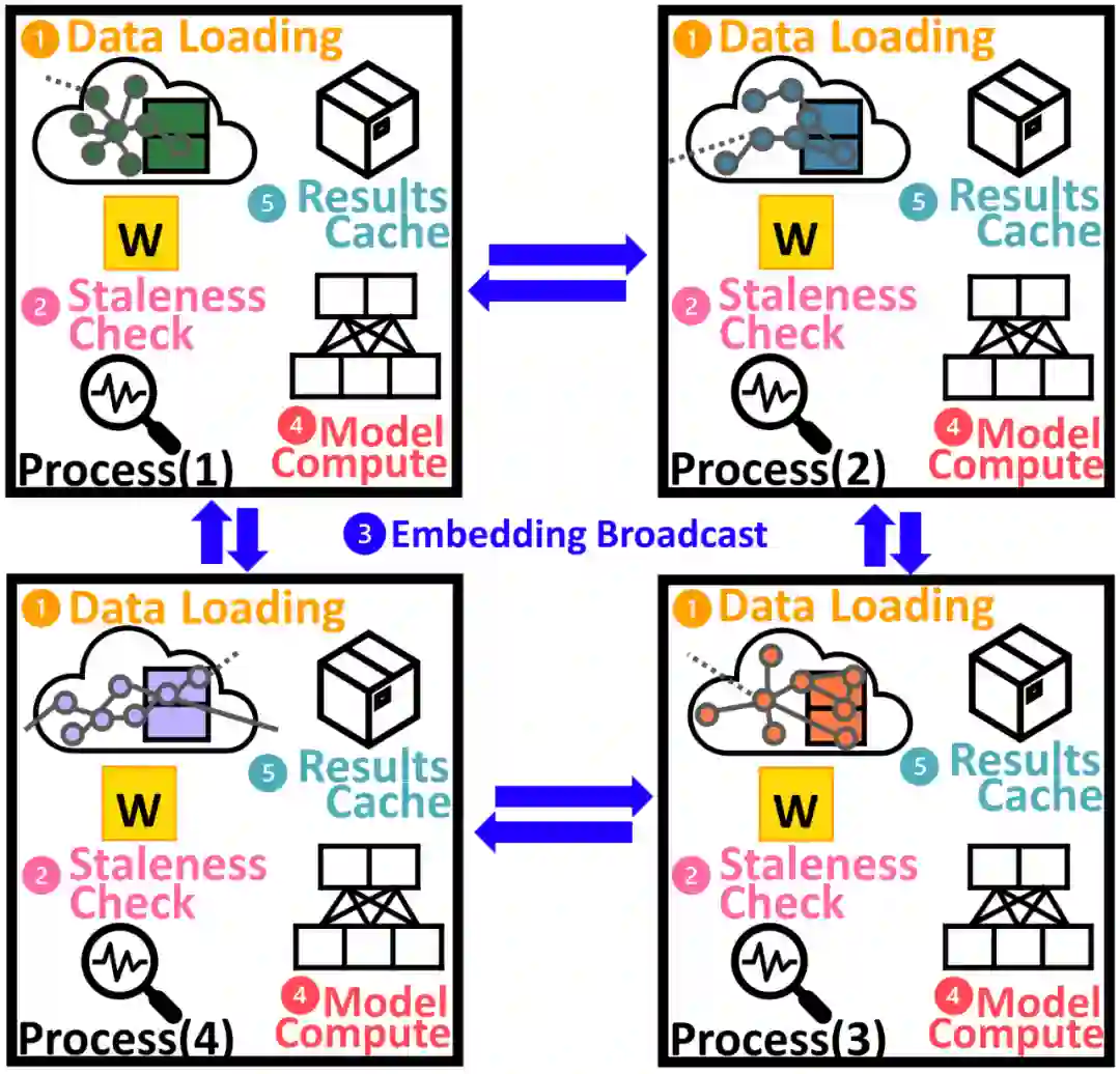 SANCUS 框架的基本训练流程,主要包括五个步骤:(1)数据加载,(2)陈旧性边界检查,(3)嵌入广播,(4)GNN 模型计算,以及(5)结果缓存。