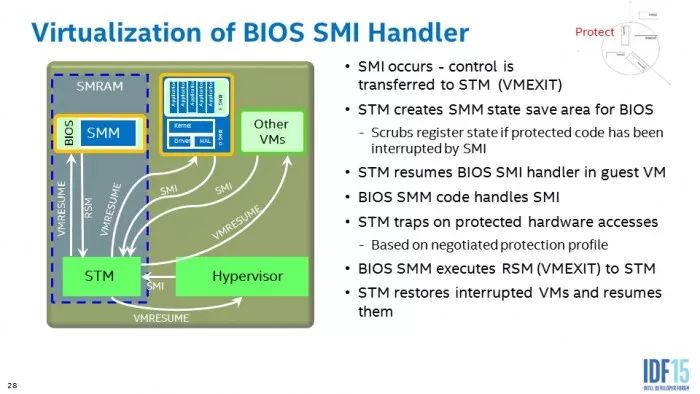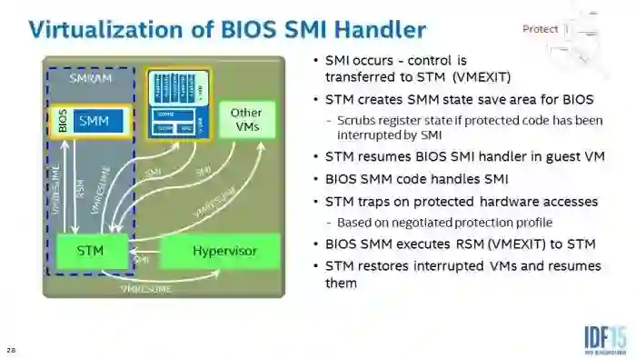 NSA 向自由固件项目 coreboot 分配了开发者,它的开发者 Eugene Myers 开始向 coreboot 贡献 SMI Transfer Monitor (STM) x86 处理器实现代码。Myers 隶属于 NSA 的 Trusted Systems Research Group,其使命是进行和资助研究保护美国信息安全的技术。