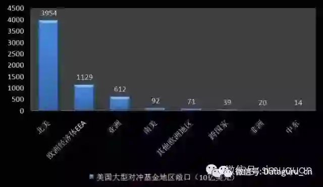 大型对冲基金管理人管理的对冲基金在北美地区的风险敞口为39540亿美元,在欧洲经济体为11290亿美元,在亚洲为6120亿美元。在其他地区的风险敞口比较小。从国别来看,在中国(包括香港)的风险敞口为1420亿美元,占在亚洲的总风险敞口的23.2%。