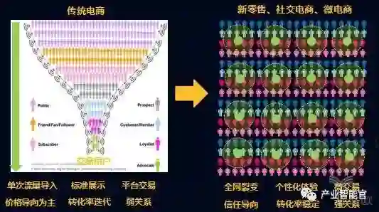 传统的电商的流量分发是漏斗的逻辑,单次流量导入,价格导向为主;而社交电商新零售的裂变是社群的裂变,形成一个关系圈的裂变,而且是把微交易全网裂变起来,是信任关系导向。