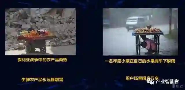 结合生鲜农产品这块我找了两张图,一个是叙利亚整个战争当中的农产品商贩,在恶劣的环境当中还在卖农产品。我们也看到印度小贩在自己的水果摊下躲雨,无论战争多么残酷,生鲜农产品一定是刚需的市场,当你做刚需的市场一定有投资价值,这里面有用户黏度。