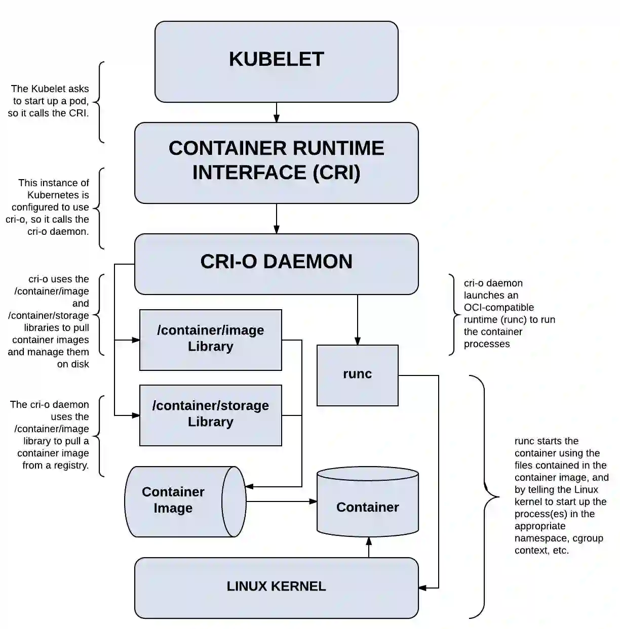 这就是 CRI-O 提供的。该名称来自 CRI 和开放容器计划(OCI),因为 CRI-O 严格关注兼容 OCI 的运行时和容器镜像。