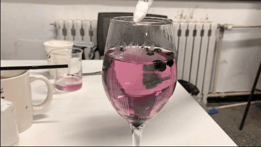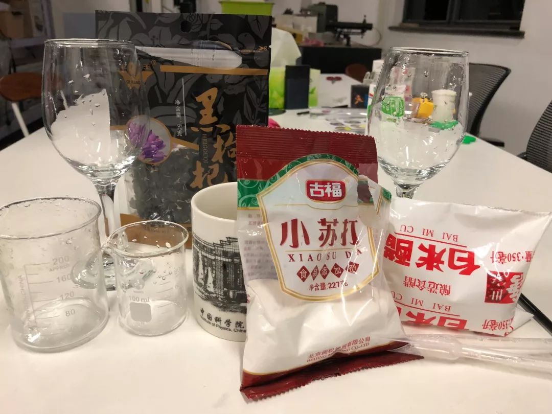 实验器材:黑枸杞,玻璃杯2个,烧杯,醋,小苏打,滴管,吸管,所标杯
