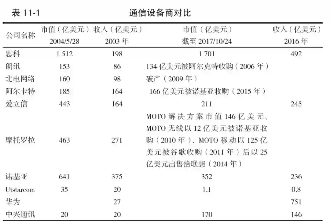 后来阿尔卡特朗讯在2015 年又整体被诺基亚以166 亿美元收购了,收购之后诺基亚目前整体的市值也只有300 多亿美元,收入只有200 多亿美元(见表11-1)。