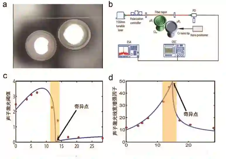 由于实验用到的耦合光机械系统在奇异点附近会出现很多新奇的物理效应如光机械耦合的有效增强、光机械非线性的增强、以及系统拓扑性质的变化,当研究人员在奇异点附近调控声子激光时,在实验上观测到一系列新奇的物理特性。首先,在奇异点附近观测到了声子激光阈值的突然降低。在实验中,当输入微腔中的光场的功率达到一定的阈值时,才能看到输出声学场的相干行为,即进入声子激光区,具体表现为声学场输出功率的突然提高,以及输出声学场线宽的突然变窄。从物理上讲,这是为了保证输入能量足够强使得作为增益介质的光学超模可以实现粒子数反转。这一阈值即为声子激光的阈值。通常,声子激光的阈值是较高的,这限制了声子激光的应用。研究人员在实验中发现在奇异点附近调节声子激光时,可以有效将声子激光的阈值降低两个数量级以上,这为声子激光在微弱信号处理、乃至在量子器件方面的应用提供了新思路。