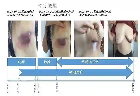 于2017.07.28起行多西他赛110mg单药化疗10次,21d/周期。化疗两个月后于2017.09.28起行曲妥珠单抗(赫赛汀)靶向治疗,首次8mg/kg,后续6mg/kg,21d/周期,共18个周期。化疗过程中肿块缓慢缩小,至第8次化疗肿块缩小不明显,第9、10次化疗肿块无缩小趋势。10次化疗过程中肿块最大径从10cm缩小至7cm左右。