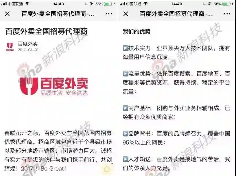 ▲2017年4月,百度外卖仍以百度品牌、技术、资源等背书,招募代理商。