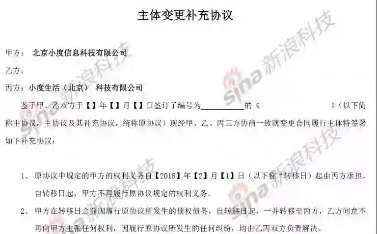新文与百度外卖方面所签协议的签约主体为北京小度信息科技有限公司,而现在被要求变更协议主体为小度生活(北京)科技有限公司。如果不签订变更协议,就无法拿到保证金。