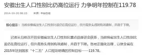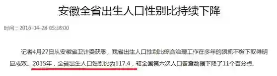 这是安徽省万万没想到的结果,不仅如此,在2014年的时候,安徽省的目标还是力争到2015年控制在119.78,结果没想到2015年性别比大幅下降到了117.4