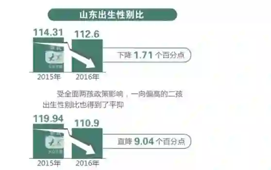 降低二孩生育成本可以极大的改善二孩性别比,这不是理论分析,而是实际已经发生的事实,还是以出生人口,以及二孩人数占全国第一的山东省为例:山东省2016年在全面二孩放开后,二孩出生人口性别比出现了惊人的改变,从2015年的119.94下降到了2016年的110.9,一年大幅下降了9.04个百分点。
