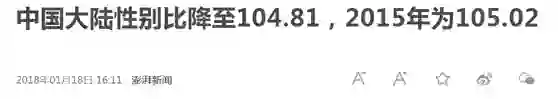 2018年1月,国家统计局公布的2017年底中国全体国民性别为104.81,而2015年总人口性别比为105.02,2016年总人口性别为104.98。也就是说,2016年比2015年下降了0.04个百分点,而2017年比2016年下降了0.17个百分点,下降幅度还有所增加。