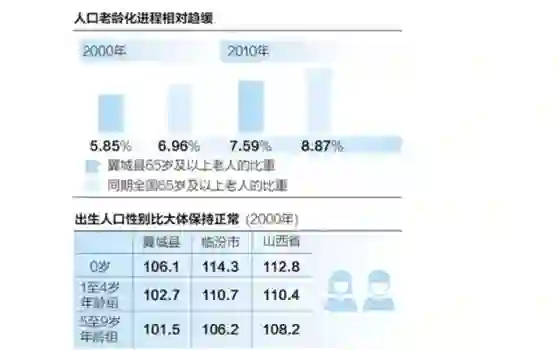 在全面一胎化的背景下,中国有四个地区实行了二孩试点,其中我国山西省临汾市翼城县,是我国唯一连续三十年试点二孩的县城,到2000年的时候,0-4岁组性别比为102.7,非常健康,而临汾市总体水平是110.7,也就是同在临汾的其他县性别比远比翼城失衡,而山西总体是110.4。值得一提的是,不仅性别比正常,而且翼城县的老龄化水平也远优于全国水平。