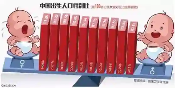 2016年1月1日,我国全面放开二孩生育,进一步放松了生育限制,2016年出生性别比继续下降到了112.88。
