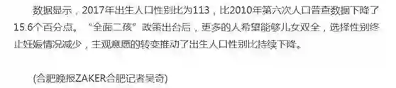 如果看发展水平较高的省会合肥市,根据合肥市统计局发布《2014年合肥市妇女发展纲要监测分析》,统计2013年全市出生人口性别比还是113.61,随着2014年单独二孩开始执行,到2015年性别比居然就大幅下降到107.32,短短两年时间就几乎恢复到正常值了。到了2017年,合肥市人口出生性别比如今已经完全恢复到了正常值。