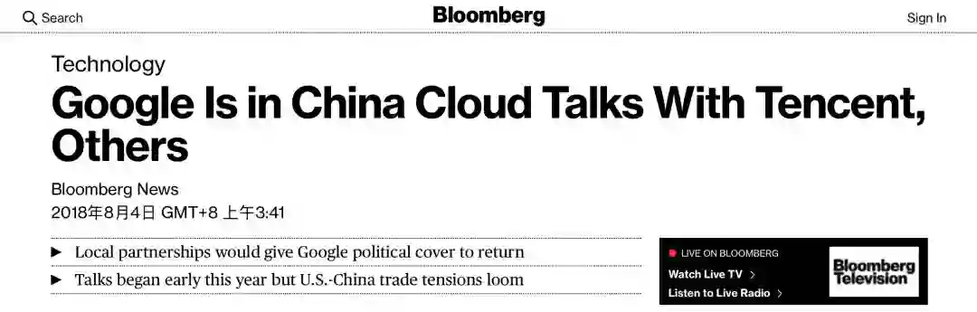 据彭博社报道,谷歌正与腾讯等洽谈将云服务引入到中国的事宜!