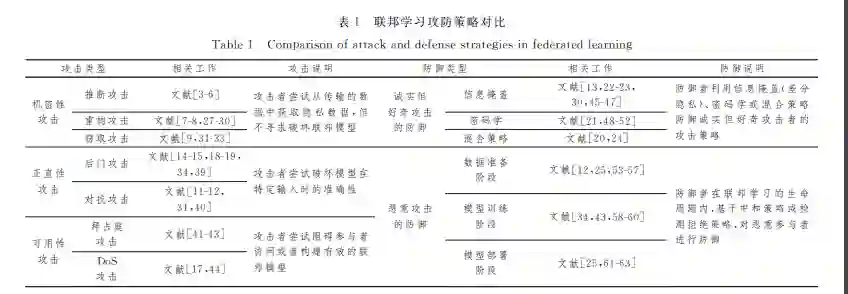 综上所述,联邦学习在建模的过程中面临着巨大的数据 安全与模型攻击挑战.文献[64]只对攻防的基础方法进行介 绍,未对联邦学习中的攻防工作进行细致讨 论.而 在 Chen 等[65]的讨论中,未对针对模型可用性的攻击策略(如拜占庭 攻击)进行综述.本文从机密性、正直性和可用性3种攻击性 质出发,重点介绍了联邦学习在建模过程中可能出现的攻击 行为,同时从诚实但好奇和恶意两个角度归纳了不同防御策 略的优点与缺点,攻防策略的对比如表1所列,最后对联邦学 习中攻防场景的发展方向和可能的应用进行了探索与展望.