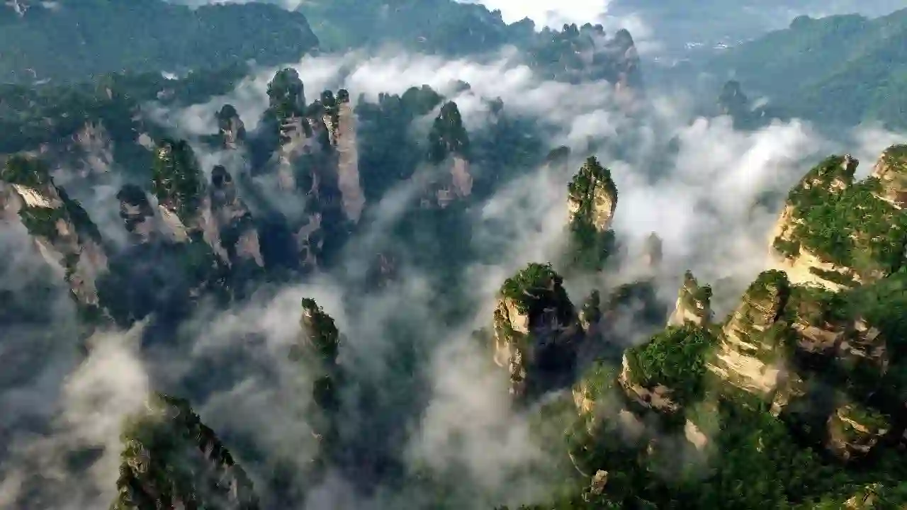 如果你看过电影《阿凡达》,对潘多拉星球上群山漂浮的场景一定记忆犹新。悬浮在空中的巨石穿云列阵,陡峭的岩壁上长满了植物,甚至还有瀑布飞流直下。实际上,要身临其境并非天方夜谭——在雨雪后的晴天来到张家界武陵源,那云雾缭绕的座座石峰正是电影取景的真实画面。
