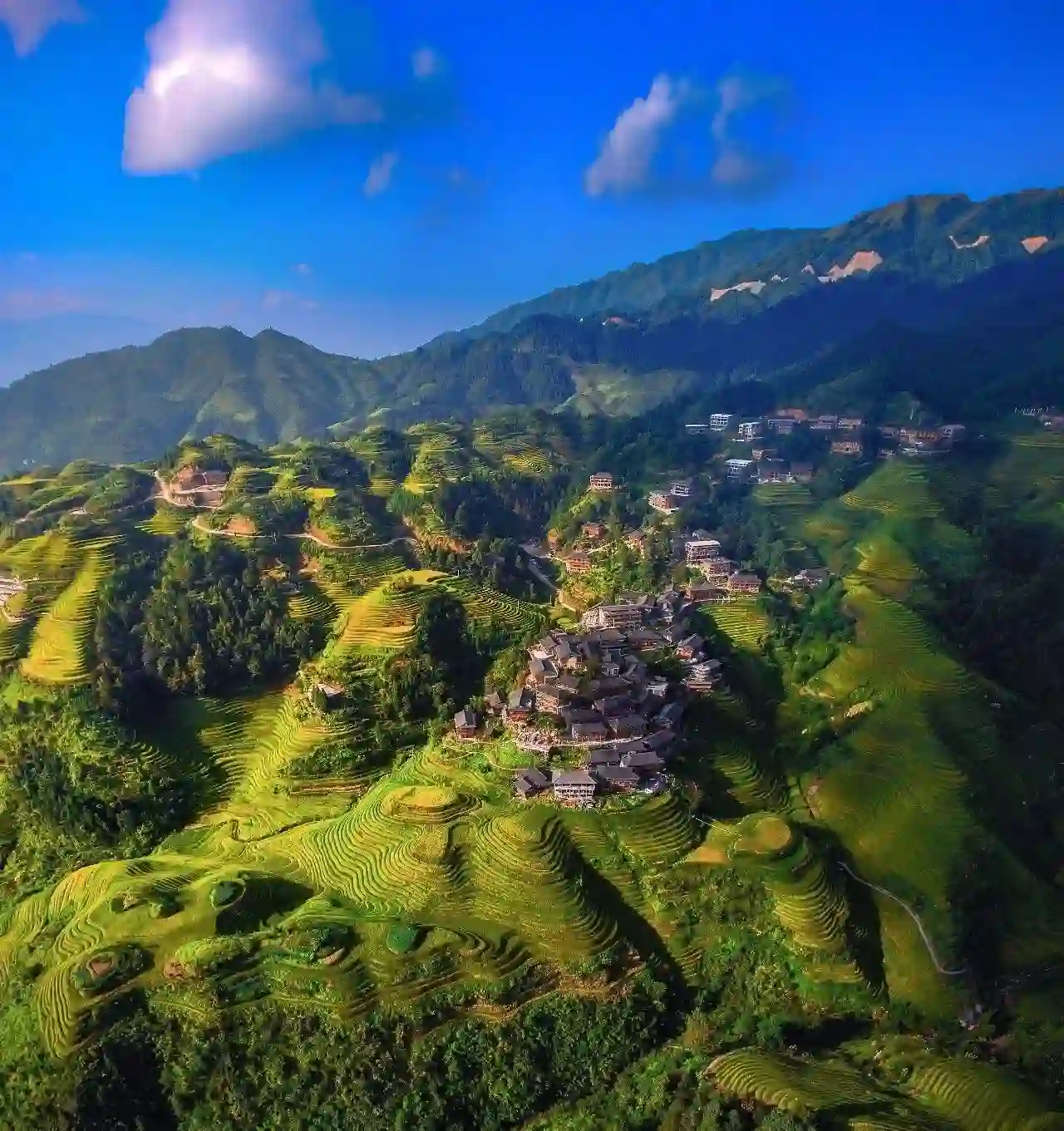 农历四月十五之后的半个月,清水沿着龙脊梯田层层流淌,整片山坡都明亮起来。当地人随着山势起伏,在缓坡上开垦大田,在陡坡上开垦小田,因地制宜,垒田成梯,成就了今天桂林北部最炙手可热的风景。