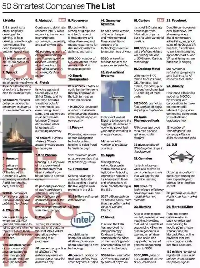 去年排名第12位的英伟达,今年跃居至第1位。在《MIT科技评论》给出的评价是:“虽然该公司的产品最初是为游戏而生,但是目前已经成为驱动深度学习和自动驾驶等突破性技术的主力。而他们在新芯片上所化的研发费用达到了30亿美元。”