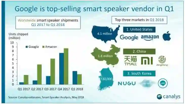 基于人工智能技术的智能音箱在全球风靡一时,许多厂商纷纷开始模仿亚马逊的这一重大创新。据外媒最新消息,一家市场研究公司的最新报告显示,一季度在全球智能音箱市场,谷歌超过亚马逊夺得冠军,中国两家厂商进入了前四名。