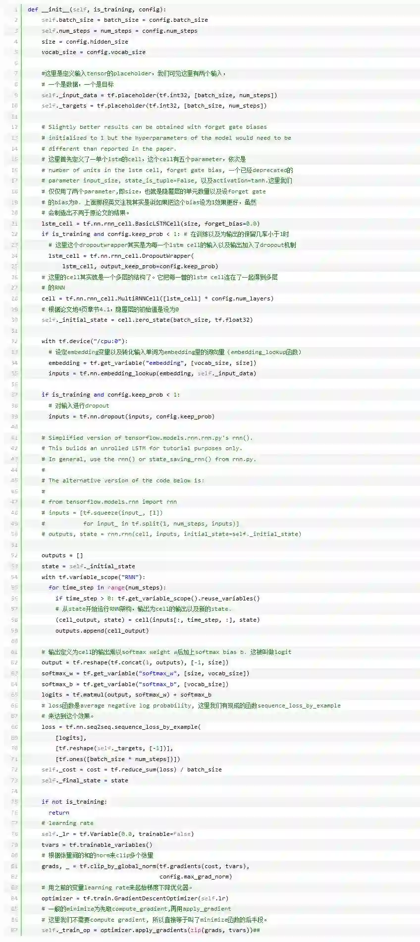 代码框架很容易理解,一开始,PTB模型被设计入了一个类。该类的init函数为多层LSTM语言模型的架构,代码如下: