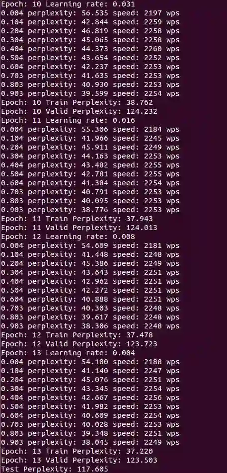 这里简便的放入了最后结果,我们可见,在13个epoch时,我们的测试perplexity为117.605, 对应了论文里non-regularized LSTM的114.5,运行时间约5到6小时。