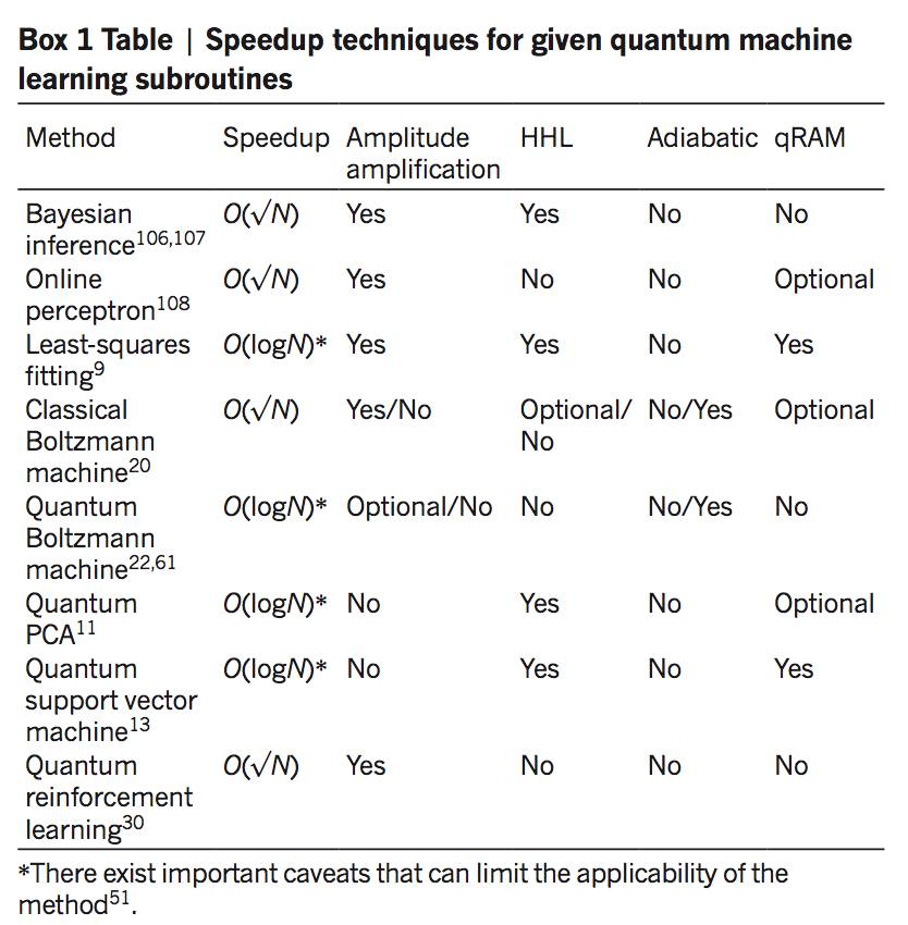 在本文的各处都会看到,机器学习的量子算法展示了量子加速。例如,几个量子基本线性代数程序(BLAS)——傅里叶变换,寻找特征向量和特征值,求解线性方程 ——与其最著名的经典算法对应物相比都展示了指数量子加速。这种量子基本线性代数程序(qBLAS)的加速可转化为各种数据分析和机器学习算法的量子加速,包括线性代数,最小二乘拟合,梯度下降,牛顿法,主成分分析,线性、半定性和二次规划,拓扑分析和支持矢量机。 同时,诸如量子退火器和可编程量子光学阵列等专用量子信息处理器与深度学习架构也有很好的匹配。 尽管目前还不清楚这种潜力可被实现的程度,但我们有理由认为,量子计算机可以识别出经典计算机无法在数据中识别的模式。