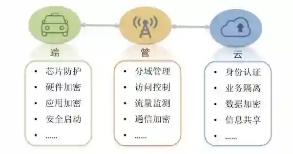 通信安全:加强访问控制,实施分域管理,对网络进行分域管理,将控制域与信息服务域进行隔离,对数据进行分域管理,降低攻击风险;加强网络切面的功能,网络侧进行异常流量检测,提升车联网网络安全防护能力;加强身份认证及秘钥管理,进行基于证书的私有通信加密。