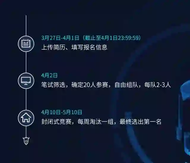 比赛自4月10号开始,为期一个月,每周淘汰一组,最终第一名的团队可获得5万现金大奖和正式offer。