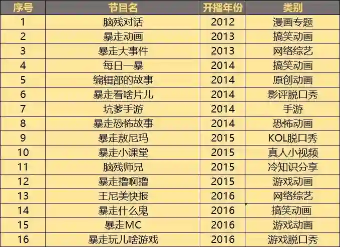 在这个模糊的思路下面,暴漫在2012年主推脑残对话系列,提高分享频率和品牌曝光度,吸收更多用户,同时把主心骨,KOL/网红王尼玛推到前端,并开始把业务重点从漫画社区转向网络综艺,模仿good news做了一个能输出观点的系列脱口秀,到2013年,这个节目正式改名叫《暴走大事件》。
