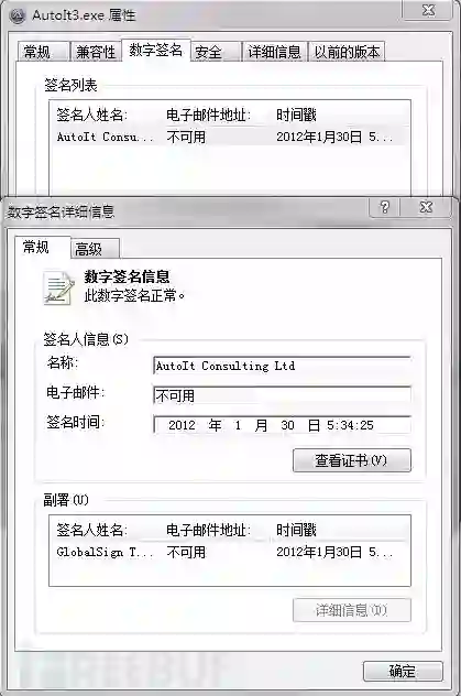大东:别急~AutoIt3.exe 是 AutoIt 脚本解释器,它带有正规数字签名。真正的病毒体其实是 googleupdate.a3x。