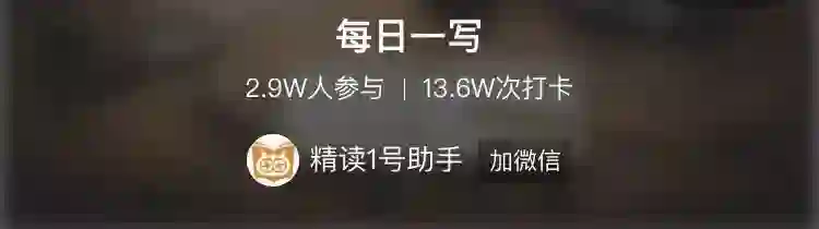 “每日一写”或“晨读打卡”,累计打卡超过50天的读友,精读君赠送终身成长词典3个月使用权益,不重复赠送。达标后,请联系精读1号助手(微信号:jingduzhushou)领取。