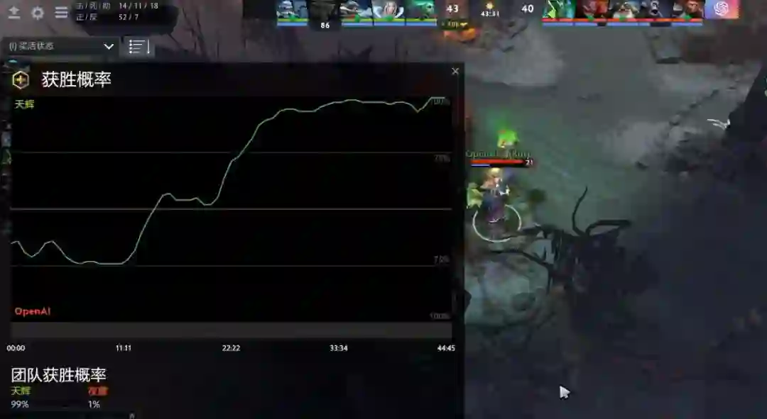 超级兵后,人类玩家虐泉,两个酱油戏耍 OpenAI 的斧王。非常有趣。此时,OpenAI 给自己估算的胜率已经只剩 1%。