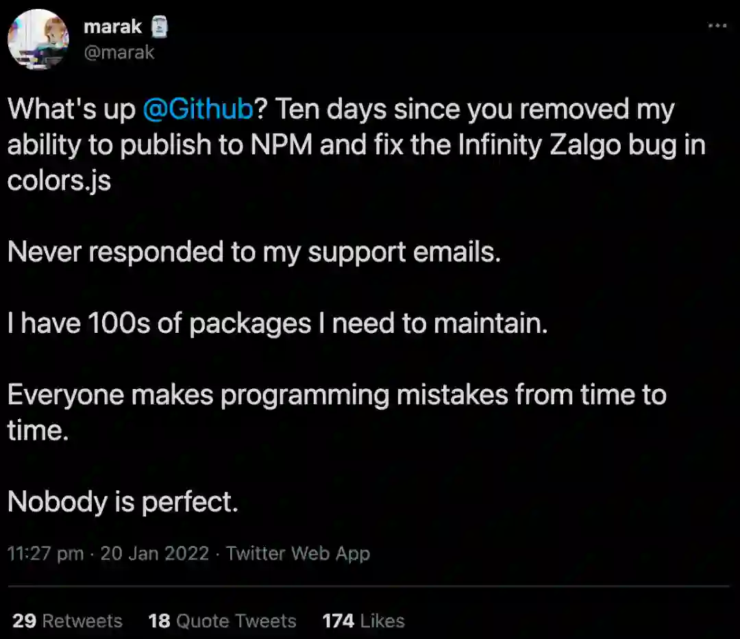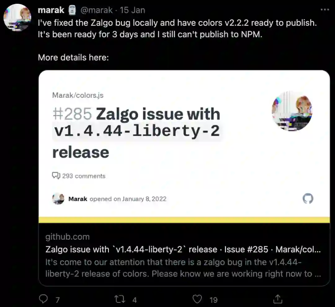 也不知是不是想挽回点名声,Marak在1月15日的时候发文表示自己已经在3天前就修好了程序的「bug」,但因为自己被封了所以没办法上传至NPM。