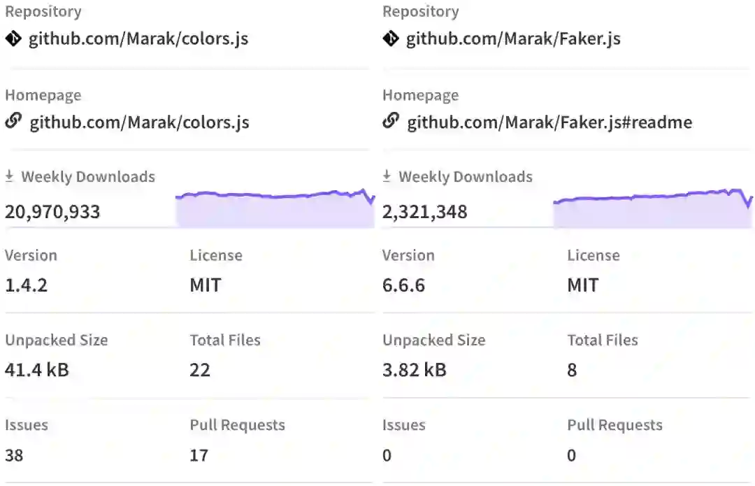 作为两个非常受欢迎的开源库,「colors」在npm上每周的下载量就超过2000万次,并且有将近19000个项目正在使用,「faker」在npm上每周的下载量超过280万次,有超过2500个项目使用。