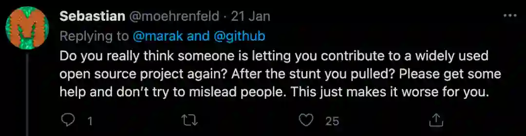 你真的认为有人会让你再次为一个广泛使用的开源项目作出贡献吗?在你耍了这套把戏之后?