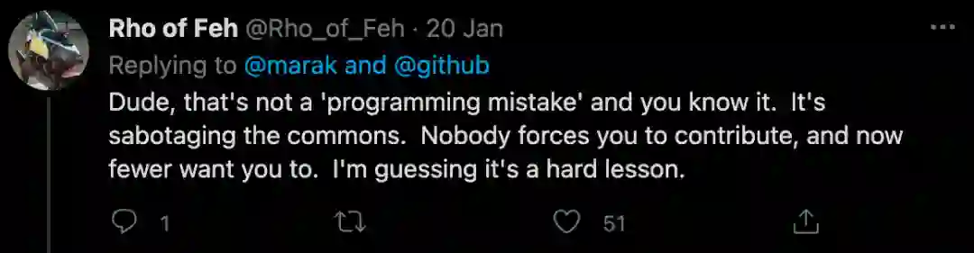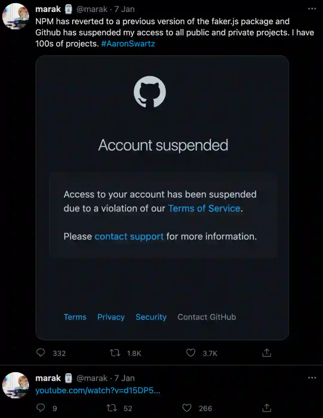 于是,作为项目的托管平台,GitHub让Marak见识到了什么是开源社区的铁拳——封号。