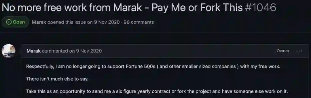 早在2020年11月,Marak就曾表示他不会再用「免费工作」来支持大公司了,而这些企业应该考虑用每年「六位数」的工资来补偿。