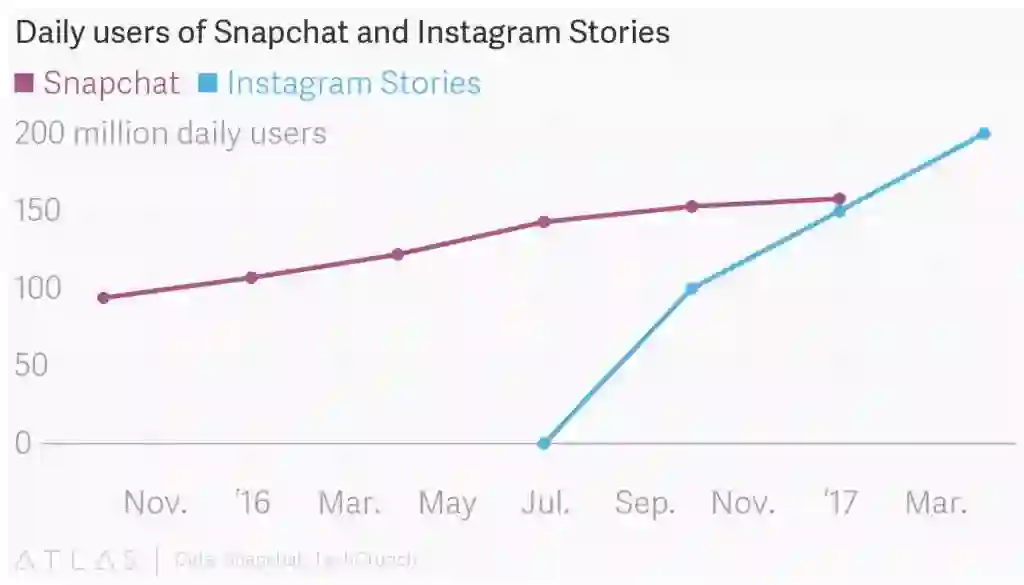 在上线三个月后,Instagram Stories功能的用户数量就达到了2亿,超过了Snapchat的1.6亿日活跃用户数量。