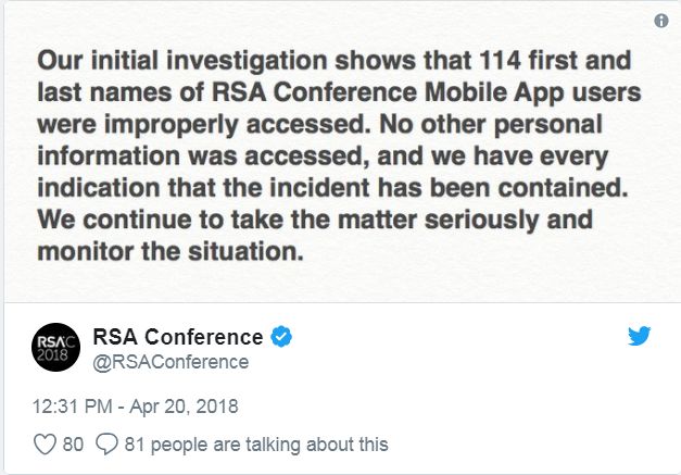 我们的初步调查表明,RSA大会移动应用程序的114个用户的姓名遭到不适当访问。其他个人信息没有被访问,我们明确表示,该事件已得到了控制。我们会继续重视此事,密切关注势态。