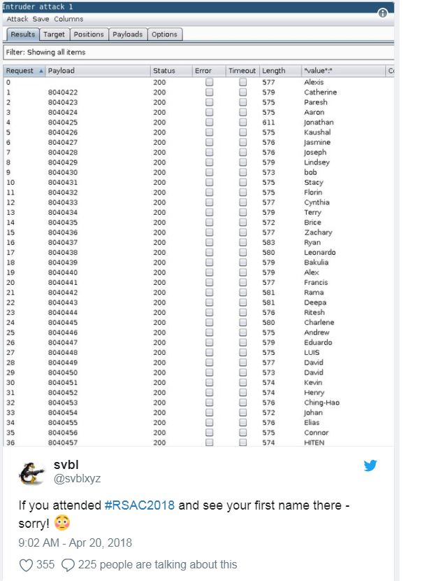 RSA大会的移动应用程序是EventbaseTechnology开发的。一名安全工程师发现了这个漏洞,他在审查这款移动应用程序时发现了漏洞,于是发到了推文上。透露后四小时内,Eventbase修复了数据泄露――问题出在一个API调用上,它让任何人都可以下载附有与会者信息的数据。