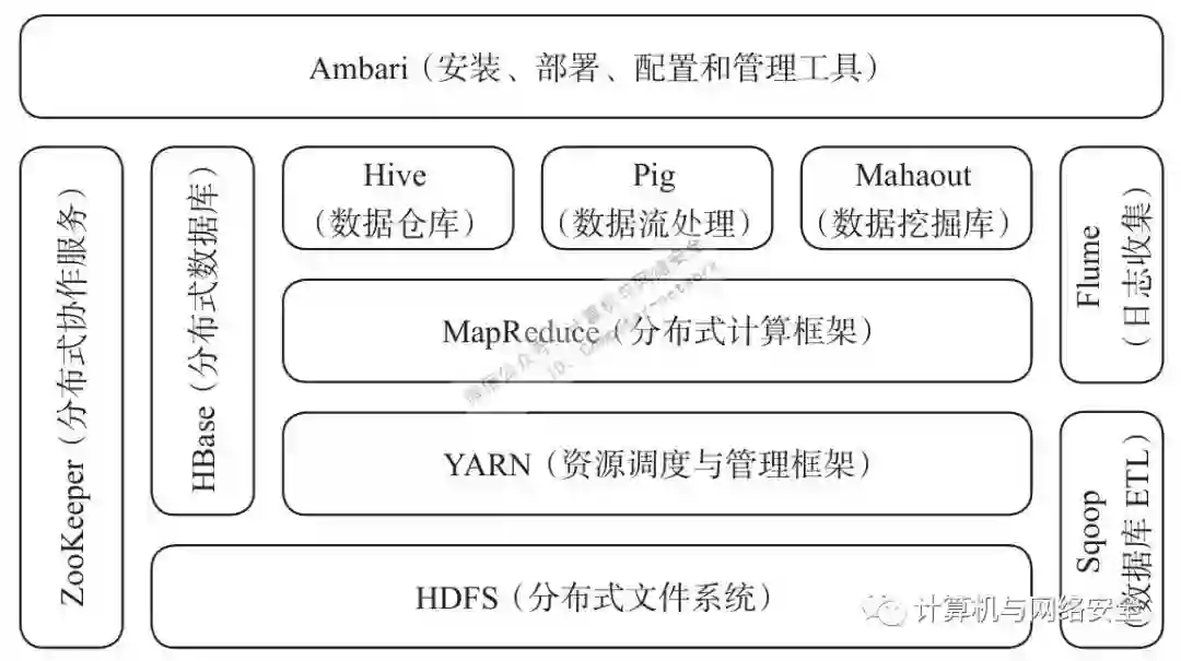 经过多年的发展,Hadoop生态系统不断完善和成熟,除了核心的HDFS、YARN和MapReduce之外,还包括ZooKeeper、HBase、Hive、Pig、Mathout、Flume、Sqoop、Ambari等功能组件。如图1所示。