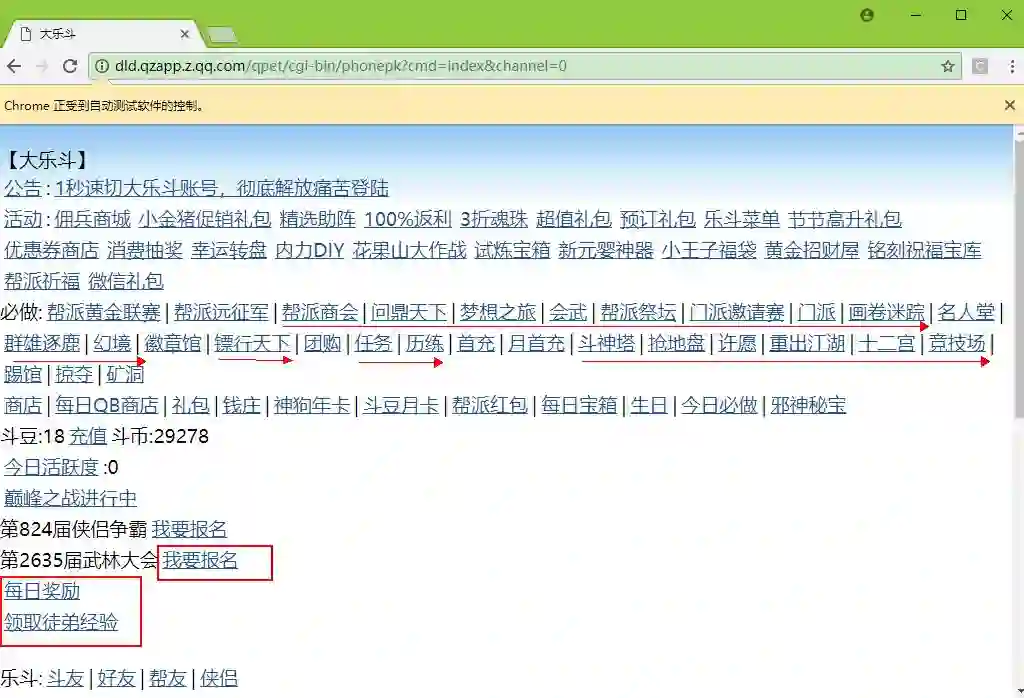 第一步:分析链接。因为直接使用网页动画版(也就是上图)网址的话,会有Flash动画,还有可能会因为网络问题而导致延迟,从而影响程序的运行。所以本文选择直接关注其公众号“Q宠大乐斗”,从开始游戏的接口进去,这样就可以进入文字版的游戏,减少不必要的网速占用。